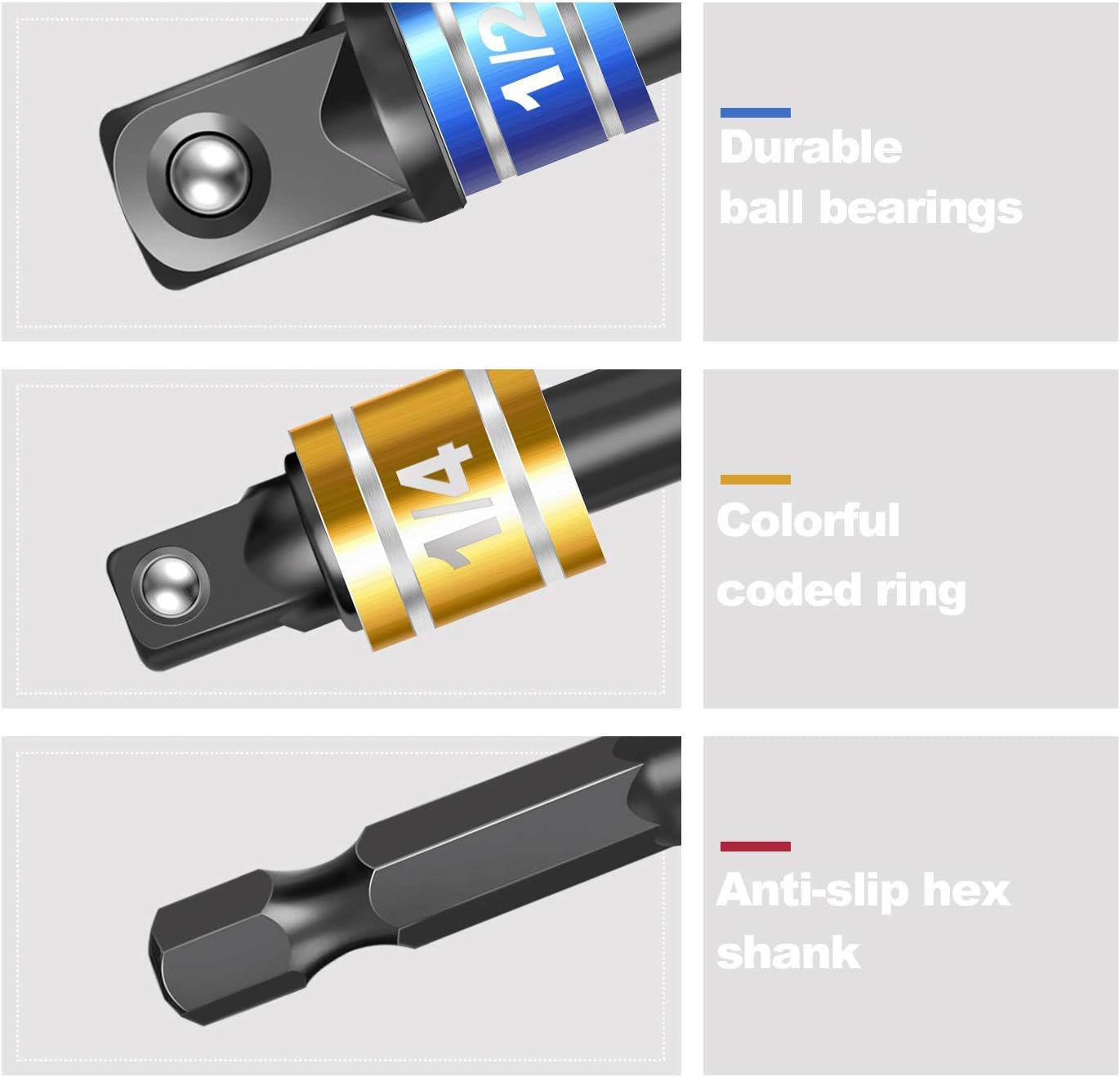 Welcome!Drill extension kit is made of high quality heavy-duty chrome vanadium steel, includes 1 piece of flexible drill bit extension, 2 pieces of 105° right angle drill bit extensions (long and short), 1 of 90 right angle screwdriver (L-shaped double-ended socket) wrench, 3 rotatable joint socket 1/4 3/8 1/2 in hex socket adapter, 10 piece screwdriver bit set, suitable for most general maintenance, high performance-price ratio.Upgrade your toolkit with our Flexible Drill Extension Set! We guarantee an exceptional drilling experience. Don't miss out on this opportunity to make your projects easier and more efficient. a world of possibilities!Features:Available for long term use:The screwdriver attachment is not easy to rust, which can accompany you for a long time.Various styles to choose:The flexible drill bit extension kit comes in different styles, meeting your different needs for construction, decoration and more.The screwdriver flexible shaft is easily to fold and take anywhere, the installation work is flexible complete match to meet daily needs.105° right angle drill attachment can to extend it to inaccessible narrow places for flexible installation work.360° rotatable bit suitable for electric, pneumatic screwdrivers and other screwdriver bits of power tools, drill extended etc.Used for screwdrivers in small spaces such as computer cases, electrical cabinets, furniture, and electrical appliancesSuitable for pneumatic screwdrivers, cordless screwdriver, pneumatic drills, low speed dc hand drill, manual screwdrivers, torque drill.Specification:Name: Flexible drill bit extension kitMaterial: Cr-V, steelSize: As shownPackage Weight: About 0.33 KG/0.7 LBTotal: 17 piecesTips:Please allow 1-2 CM/0.39-0.78IN or 0.01-0.03 KG/0.02-0.06LB differs due to manual measurement.Please allow slight color difference due to different monitor.Package1 X Bendable drill bit extension1 X Short 105 Degree right angle drill extension1 x Long 105 Degrees drill bit extension1 x L-shaped double ended socket wrench1 X 10 in 1 set combination screwdriver bit set3 X Universal socket adaptersStrong after-sales service: If there are any questions the purchase process, we will provide the best service for you.