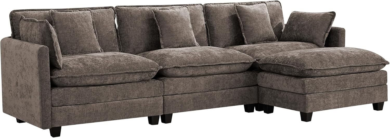 3-Seater Cloud Couch with Ottoman, Oversized Comfy Modular Sectional L Shaped Sofa with Deep Seats, Chenille Couch for Living Room, Beige