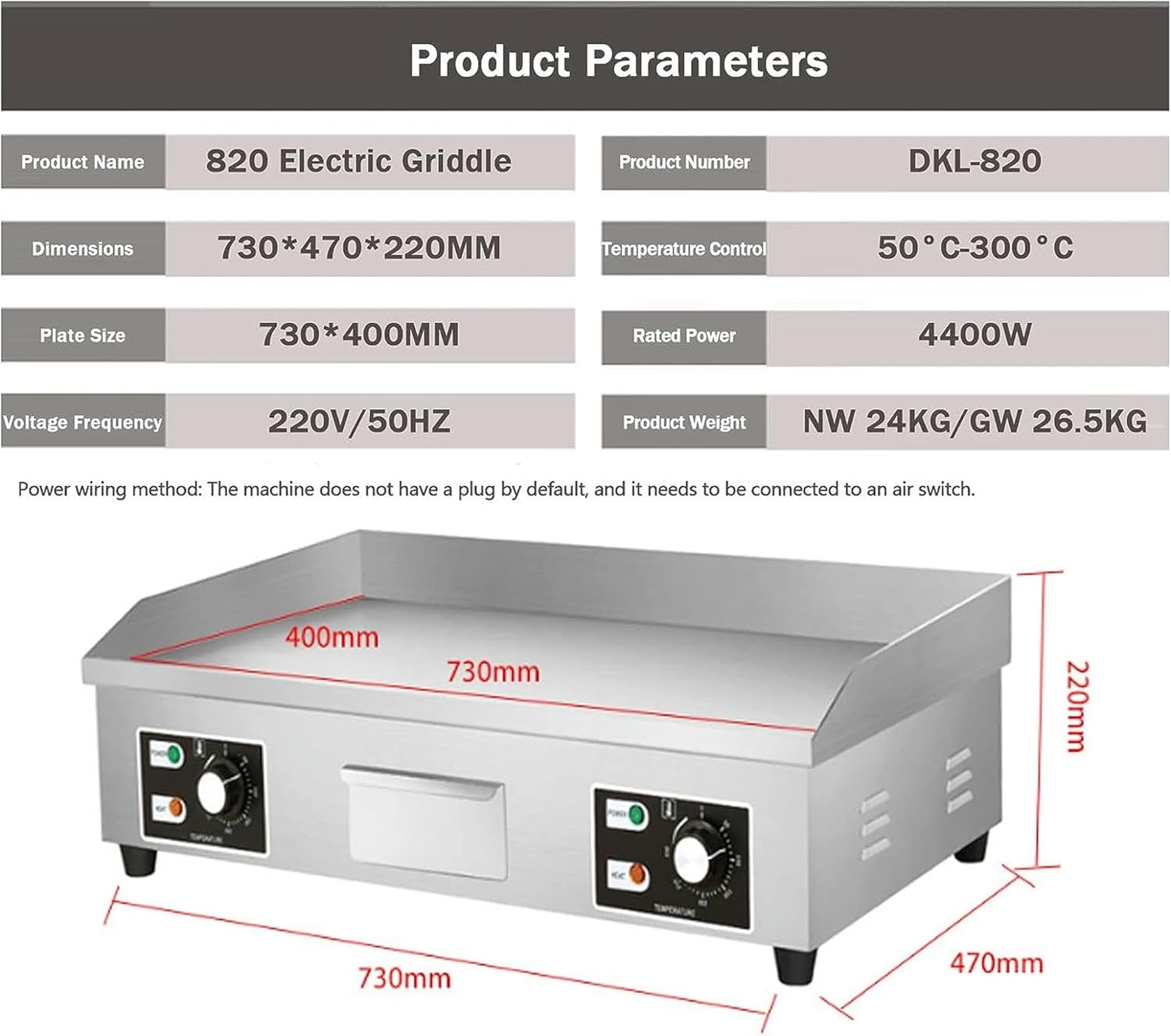 Model Number:Powerful Efficient Griddle with Great Cooking PerformanceGreat for whipping up bacon, burgers, cheesesteaks, and more at your busy snack bar, concession stand, or restaurant, this countertop griddle is an efficient and durable addition to your kitchen. Independent controls and versatile features allow you to customize this unit to meet your needs!Commercial Electric Griddle: Uniform Heating & Large Cooking AreaOur commercial electric griddle is very suitable for families or restaurants. It can cook a variety of foods and save you time. Stainless steel is durable and easy to clean. Accurate temperature control makes the heating tube heat evenly and the food more delicious. Various intimate details - oil drip hole, oil collecting box, heat dissipation hole, etc. at the same time, it is also equipped with accessories to provide a high-quality foundation for your use. Come and choose us.Wide ApplicationCan be used at home or in commercial places,Perfect for processing pancakes, crispy bacon, grilled cheese,full breakfast, fried dishes, omelet, pizza, steak, burger.Package Content:1x countertop griddle grillTIPS: Before using the griddle for the first time, using dishwashing liquid and water to clean the cooking plate, then heating. Finally, apply a layer of oil to avoid the plate to be rust.