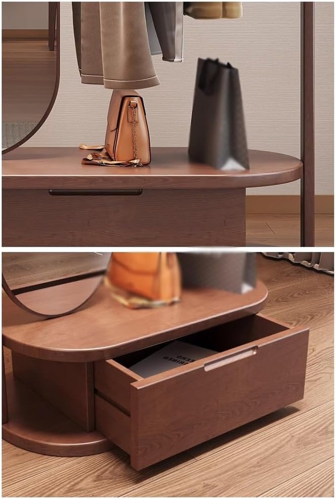 Full Length Mirror with Coat Rack Free Standing Floor Mirrors,Elevate your home's style with our beautiful Floor Coat Rack, a perfect combination of functionality and elegance. Crafted from high-quality solid wood and finished in a rich walnut hue, this coat rack serves as both a practical storage solution and a stunning decor piece. **Key Features:** - **Durable Construction:** Made from premium solid wood, ensuring long-lasting use and a classic look. - **Versatile Style:** Perfect for various locations in your home, including the entryway, living room, study, or bedroom, seamlessly fitting into any decor theme. - **Space-Saving Design:** Organize your space while adding a touch of sophistication, making it ideal for small apartments or busy households. **Usage Scenarios:** Imagine returning home to a warm, welcoming entryway featuring this elegant coat rack. It effortlessly holds your coats, hats, and bags, helping you maintain an organized space. Picture it greeting guests in your hallway or serving as a chic accent in your study, complementing your workspace beautifully. **Product Value:** Our Floor Coat Rack not only enhances your home's aesthetic but also encourages a clutter-free environment. With this practical storage solution, say goodbye to messy piles of clothing and accessories. It allows your family and guests to keep their belongings tidy and accessible. **Note:** This listing includes one coat rack only; hangers and other accessories are not included. Please note that slight color variations may occur due to lighting and monitor settings. Invest in this stylish coat rack today and transform your space into a refined and organized retreat!