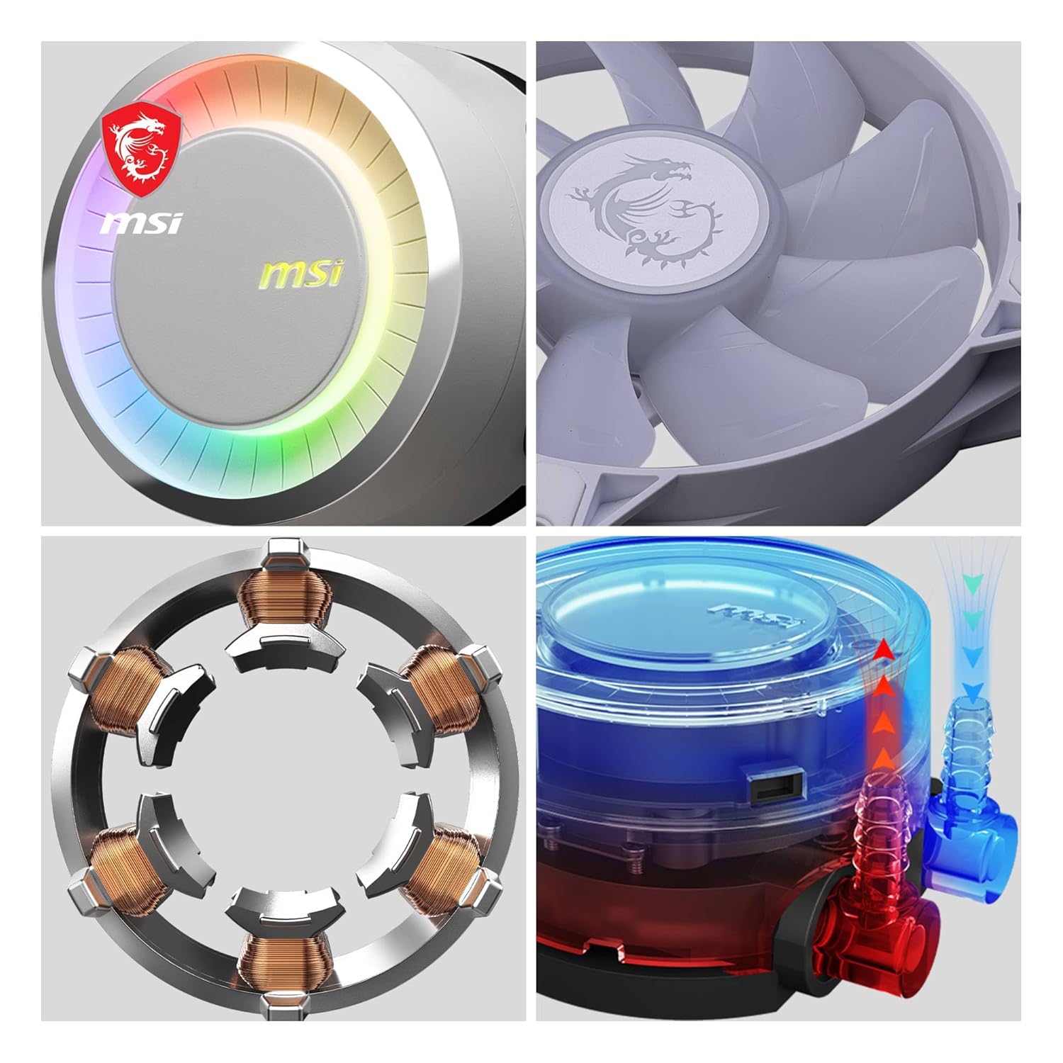 THE COLDER, THE BETTER MSI MAG CORELIQUID E-Series AIO CPU liquid coolers combine sophisticated design and superior performance. The signature features of the E-Series are its advanced cooling technologies for the latest CPUs and stylish 270-degree rotatable ARGB blockhead with MSI logo (Mystic Light supported). Advancements in cooling include an enlarged cold plate to accommodate off-centre CPU hotspots, improved micro-channel surface-area-to-volume ratio, separated coolant chambers within the pump block, split-flow radiator, and premium fluid dynamic bearing (FDB) radiator fans (PWM with ARGB lighting). Aesthetically, the MAG CORELIQUID E-Series ARGB blockhead is inspired the total solar eclipse, and can be rotated to align with any system orientation. Blockhead & fan lighting can be synced and customized via the Mystic Light utility within MSI Center, which also supports easy-to-use fan & pump curve settings as well as profiles. Fully compatible with AMD* (AM5, AM4) and Intel (LGA 1700, 1200, 1156, 1155, 1151, 1150) CPU sockets, the MAG CORELIQUID E-Series kits include thermal paste and cable accessories. *Additional AMD TR4/sTRX4 socket support and low-noise adapter cable available with the MAG CORELIQUID E360.