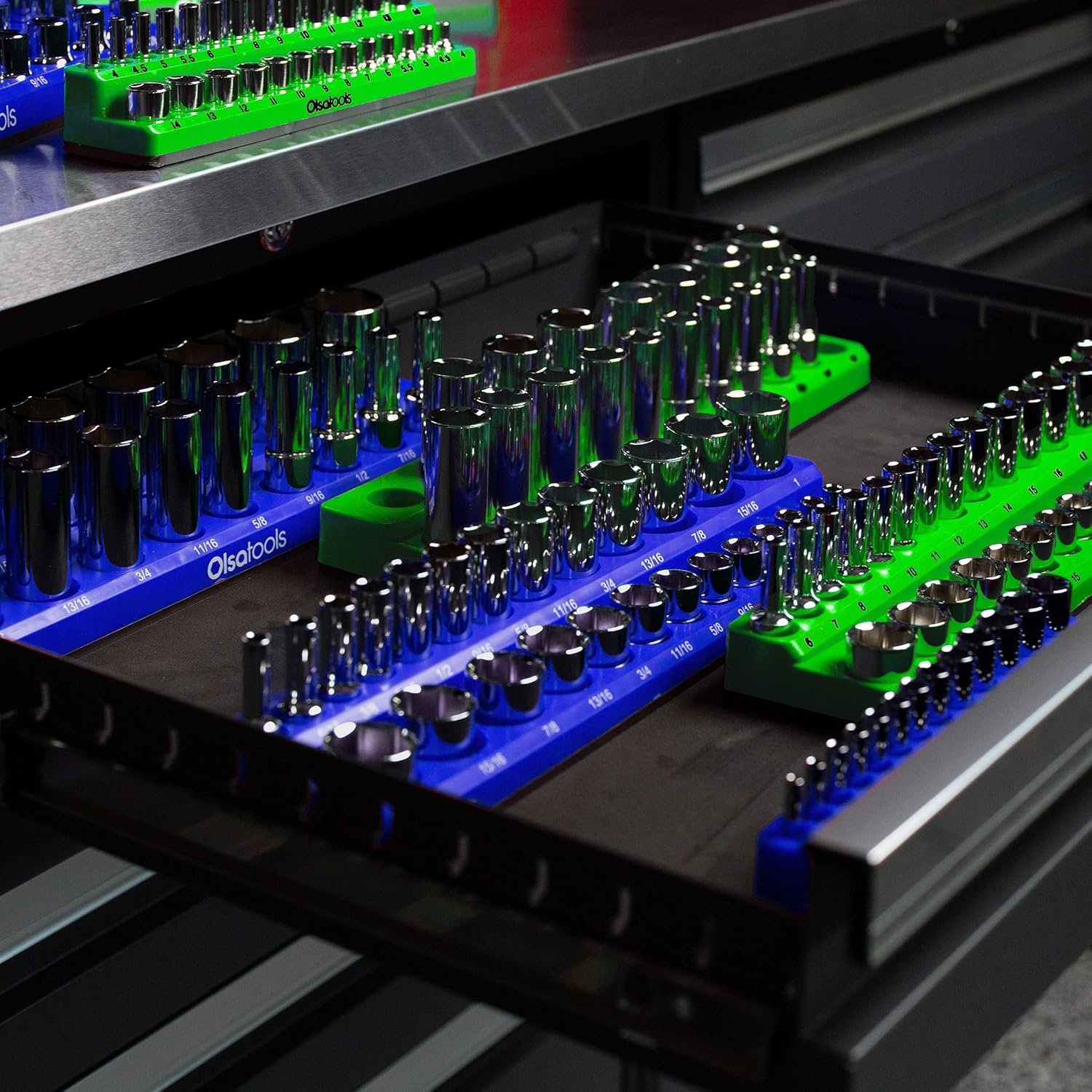 • MAKE YOUR JOB LESS FRUSTRATING IN MINUTES - These Olsa Tools Magnetic Socket Organizer Set Kit (for SAE sockets) can store up to 68 of your 1/4", 3/8", and 1/2" drives SAE sockets. That's right all of your tools in one place, what you always wanted. Start enjoying the neatness and organization you deserve.