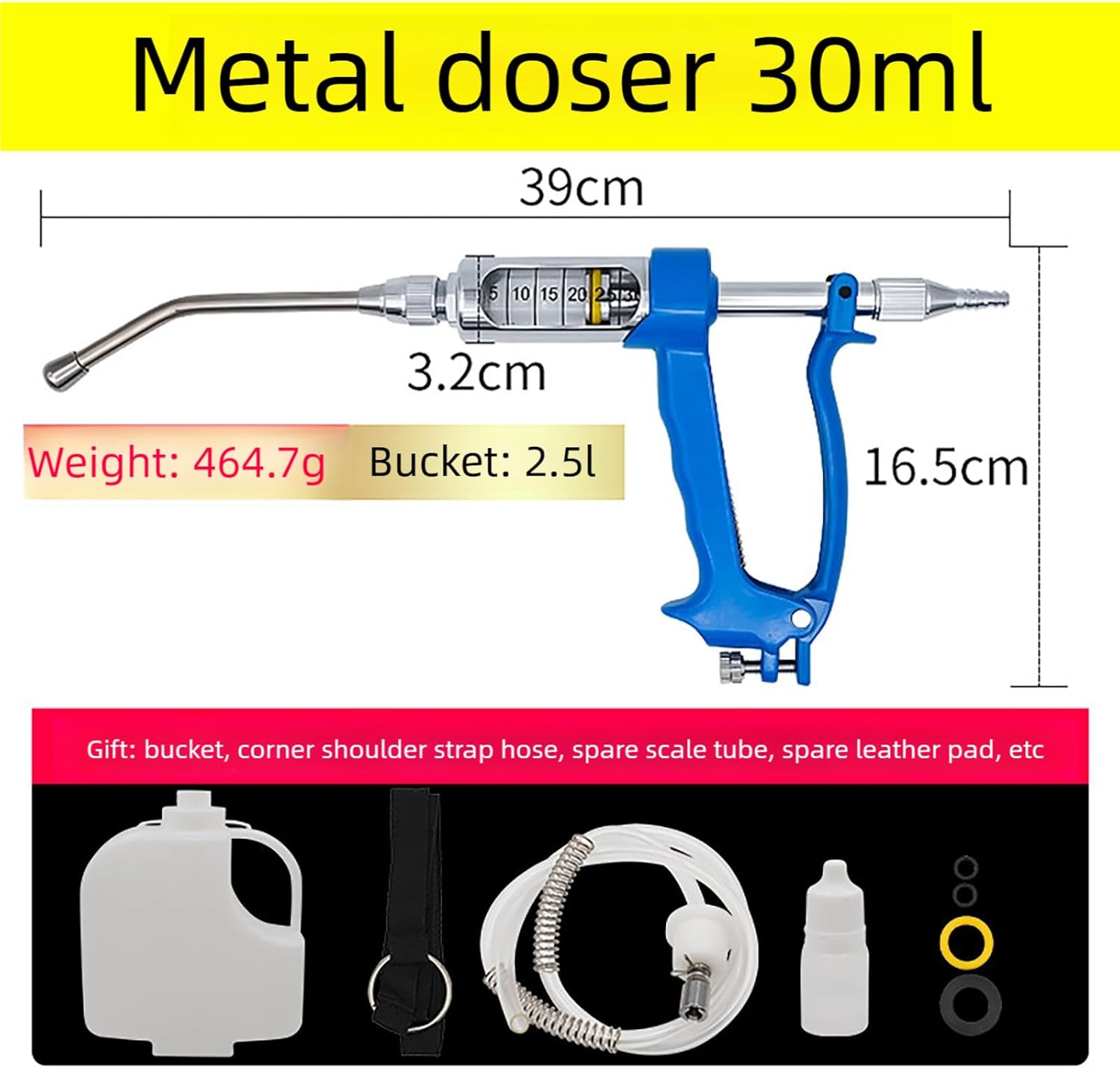 This veterinary metal feeding gun is a durable and precise dosing tool designed for efficient oral medication delivery to various livestock and poultry including pigs cows sheep horses and more. Featuring an adjustable dosage scale and a bite-resistant metal nozzle with a comfortable handle, it ensures safe administration while minimizing stress for animals and operators. Ideal for modern farms and large-scale breeding operations, this easy-to-use device saves time and labor by enabling single-person operation without compromising accuracy or animal welfare. Available in various sizes 5ml: 30*16.5*2.1cm 10ml: 38.5*16.5*2.4cm 20ml: 38.5*16.5*2.8cm 30ml: 39*16.5*3.2cm
