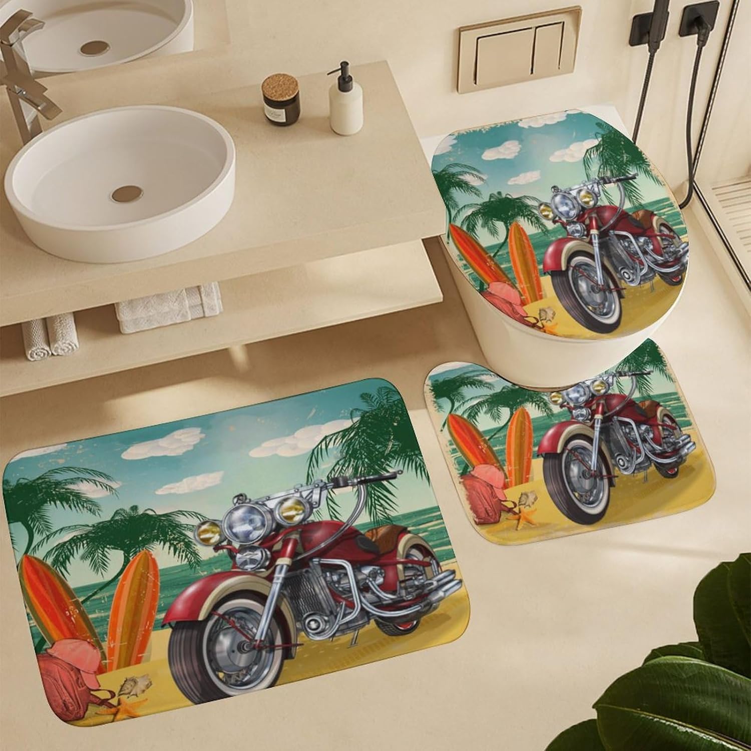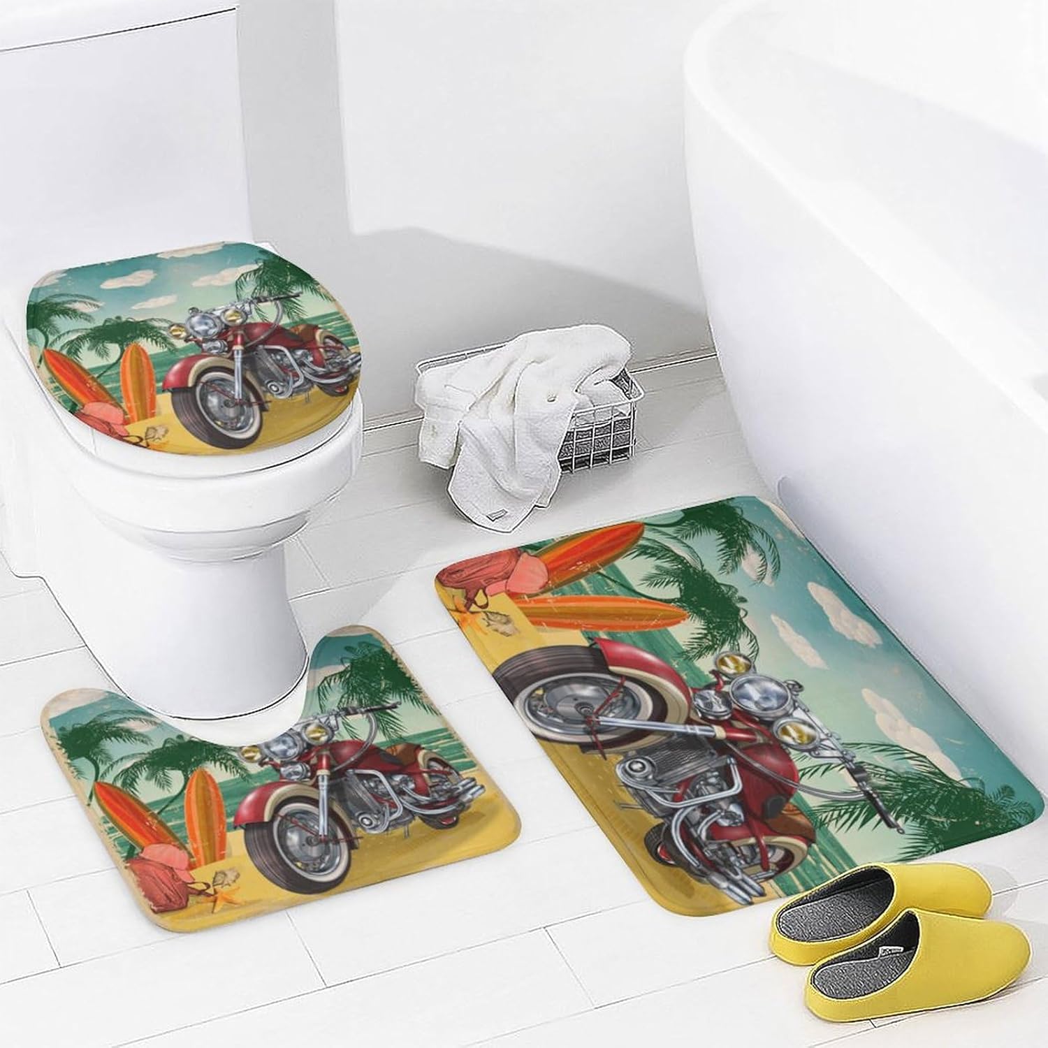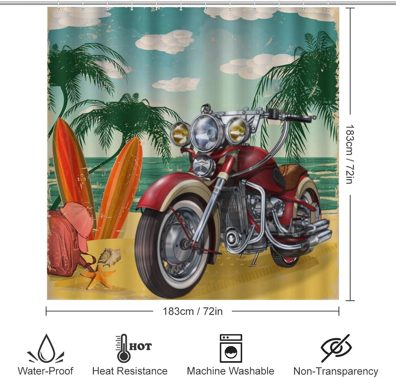 brebasf Vintage Antique Motorcycle Patterned 4 Pieces Shower Curtain Set This Rustic Western Farm Wood Boards Old Motorcycle American Flag 4 Pieces Shower Curtain Set liven up your indoor or outdoor spaces with a sense of airiness and beauty.Material DescriptionCoral velvet + waterproof oxford fabric (shower curtain)AccessoriesShower curtain + floor mat + long mat + toilet seatShower Curtain: 72 "W x 72 "L,Mat: 14 "W x 17.3 "L,Floor Mat:17.5 "W x 29.1 "L,Toilet Mat: 13.4 "W x 17.7 "LProduct PerformancePREFERRED MATERIAL: This brebasf shower curtain 4-piece set is made of coral velvet + waterproof oxford fabric,the fabric is soft and delicate,skin-friendly and comfortable,good touch.DURABLE: This coral velvet floor mat is super absorbent,non-slip and durable.EASY TO CLEAN: It's very easy to clean and maintain,usually cleaning just need a vacuum cleaner to absorb the dust,easy to store and easy to take care of on a daily basis. When not in use,gently roll it up and put it in the corner,long service life.WATERPROOF: This shower curtain is made of waterproof oxford fabric,waterproof performance is good,can avoid water spraying to other places in the bathroom.Applicable scenariosSuitable for home bathroom,guest room,bedroom,living room and other places.Washing Instructions Washable,not machine washable.Special NoteThis size data in the flat under the measurement,due to different measurement methods,the error of 1-2cm within the normal phenomenon.Warm reminderThe picture display effect is for reference only,the final effect in kind shall prevail! Due to production batches,machinery and equipment and other objective factors,it is difficult to avoid or there will be a small color difference,location and size errors,such as the above problems are normal phenomena,will not be included in the scope of after-sales processing.